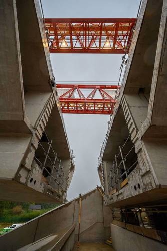 Edging forward from north to south and supported on the viaduct’s 56 piers, the 160 metre long launcher used a balanced-cantilever method to lower deck segments into place to form half an arch either side of a pier before moving to the next pier to complete the arch span by repeating the process.